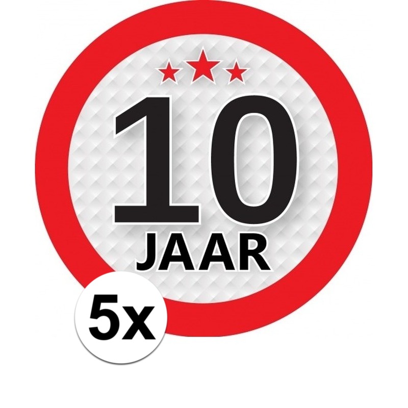 10 Jaar leeftijd versiering ronde stickers 9 cm 5 stuks. Leuke ronde stickers met het cijfer 10. Leuk als versiering voor een 10e verjaardag. De diameter van de stickers is ongeveer 9 cm. 10 jaar verjaardag/jubileum feestversiering artikelen.