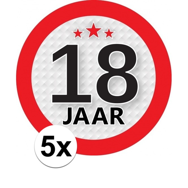 5x 18 jaar leeftijd versiering sticker rond. Een leuke ronde sticker met het cijfer 18. Leuk als versiering voor een 18e verjaardag, een jubileum of iets anders met dit cijfer. De diameter van deze sticker is ongeveer 9 cm. Verjaardag/jubileum feestversiering artikelen.