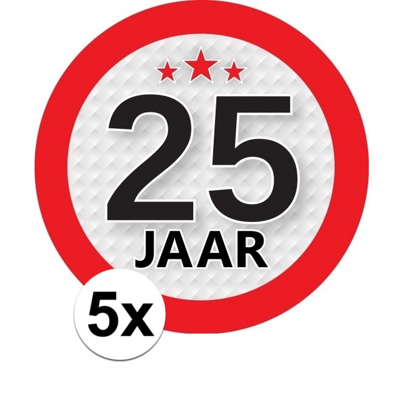 5x 25 jaar leeftijd versiering sticker rond. Een leuke ronde sticker met het cijfer 25. Leuk als versiering voor een 25e verjaardag, een jubileum of iets anders met dit cijfer. De diameter van deze sticker is ongeveer 9 cm. Verjaardag/jubileum feestversiering artikelen.