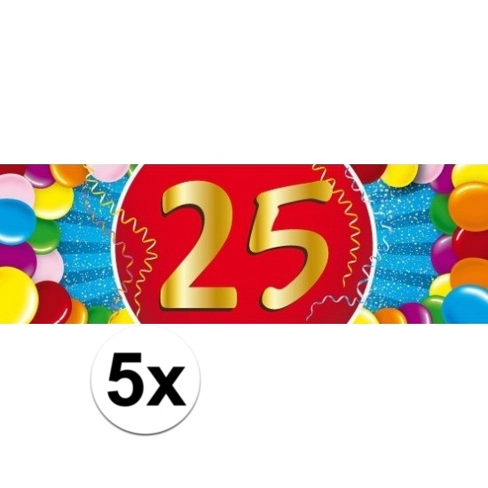 25 Jaar leeftijd versiering stickers 5 stuks. Vrolijk gekleurde stickers met het cijfer 25. Leuk als versiering voor een 25e verjaardag. Het formaat van de stickers is 19,6 x 6,5 cm. 25 jaar verjaardag/jubileum feestversiering artikelen.