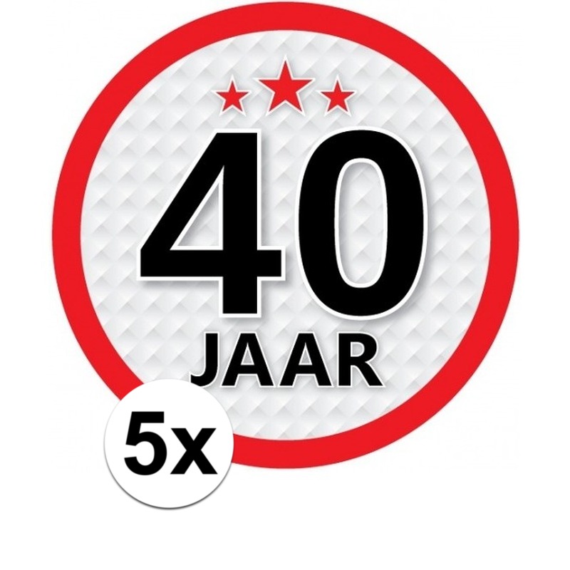 5x 40 jaar leeftijd versiering sticker rond. Een leuke ronde sticker met het cijfer 40. Leuk als versiering voor een 40e verjaardag, een jubileum of iets anders met dit cijfer. De diameter van deze sticker is ongeveer 15 cm. Verjaardag/jubileum feestversiering artikelen.