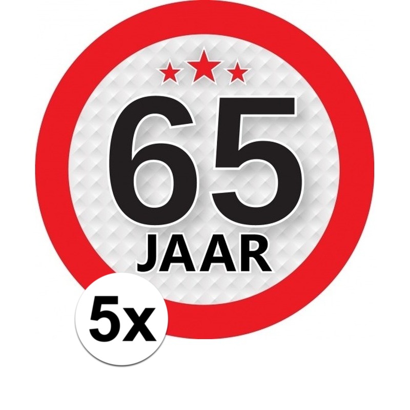 65 Jaar leeftijd versiering ronde stickers 9 cm 5 stuks. Leuke ronde stickers met het cijfer 65. Leuk als versiering voor een 65e verjaardag. De diameter van de stickers is ongeveer 9 cm. 65 jaar verjaardag/jubileum feestversiering artikelen.
