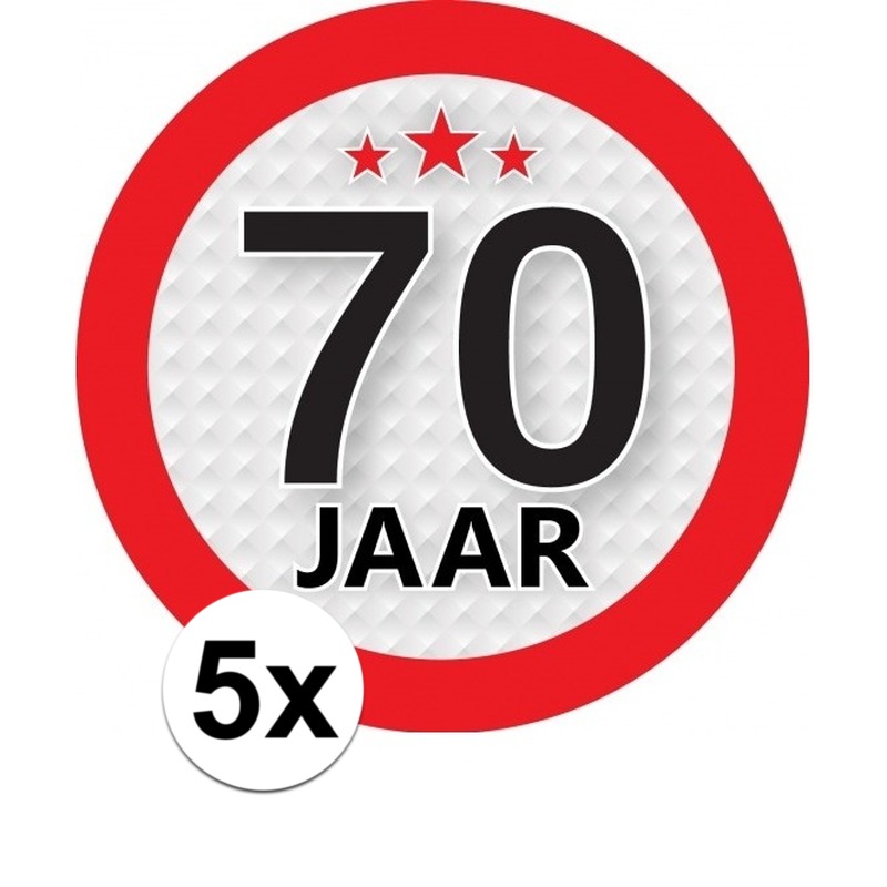 5x 70 jaar leeftijd versiering sticker rond. Een leuke ronde sticker met het cijfer 70. Leuk als versiering voor een 70e verjaardag, een jubileum of iets anders met dit cijfer. De diameter van deze sticker is ongeveer 9 cm. Verjaardag/jubileum feestversiering artikelen.