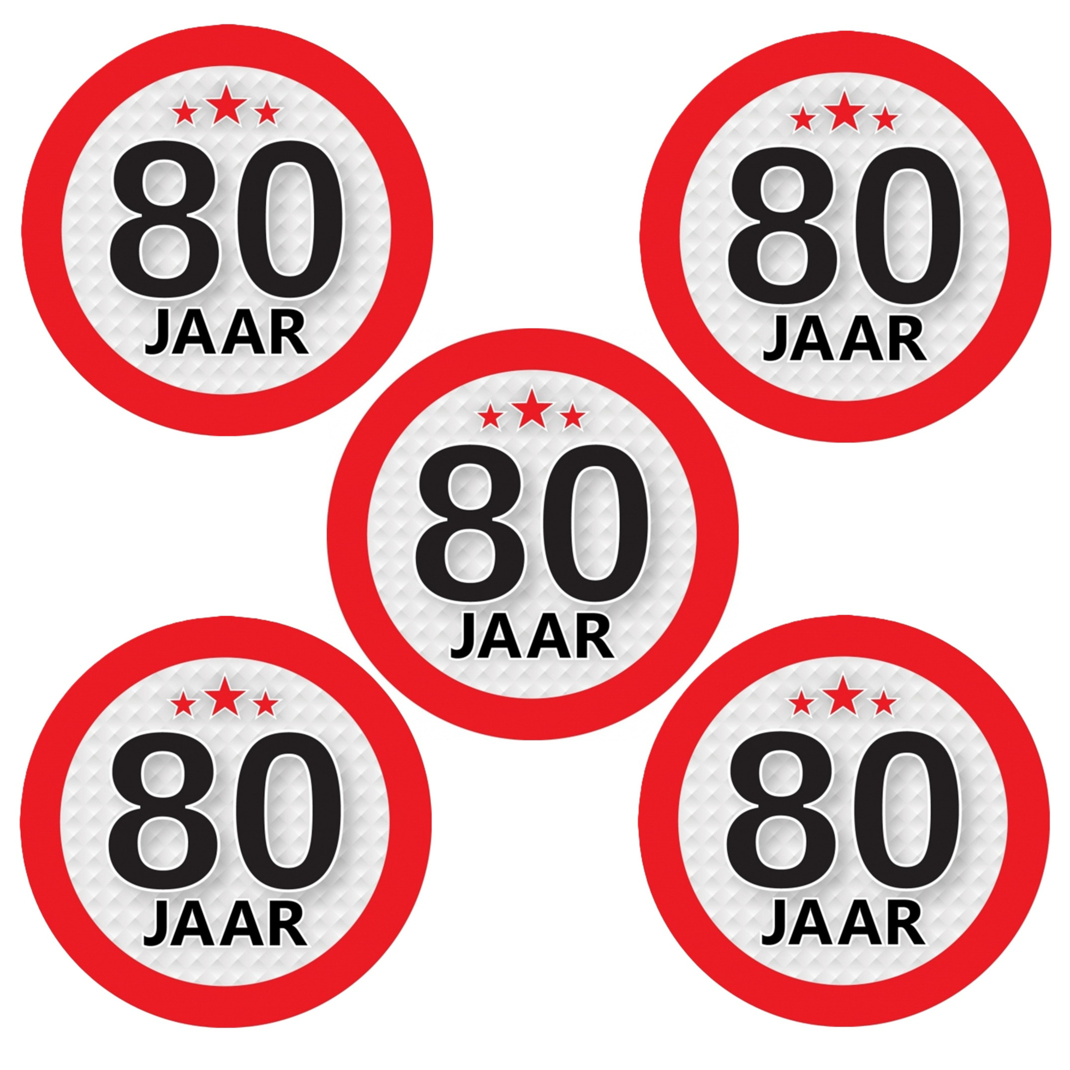 5x 80 jaar leeftijd versiering sticker rond. Een leuke ronde sticker met het cijfer 80. Leuk als versiering voor een 80e verjaardag, een jubileum of iets anders met dit cijfer. De diameter van deze sticker is ongeveer 9 cm. Verjaardag/jubileum feestversiering artikelen.