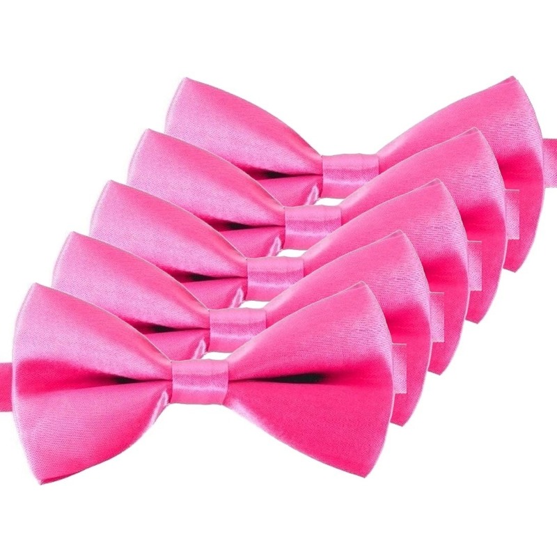 5x Roze verkleed vlinderstrikjes/vlinderdasjes 12 cm voor dames/heren. Reeds gestrikte roze strik/das met een elastieken band met haak en oog sluiting voor rond de hals, die u kunt verstellen middels een schuifje. Handige strik die u niet zelf hoeft te strikken. Materiaal: polyester, kunststof. Formaat: 12 cm x 6,5 cm. U ontvangt 5 strikjes. Roze thema/Gay Pride Carnaval/feest verkleedaccessoires/feestartikelen voor volwassenen.