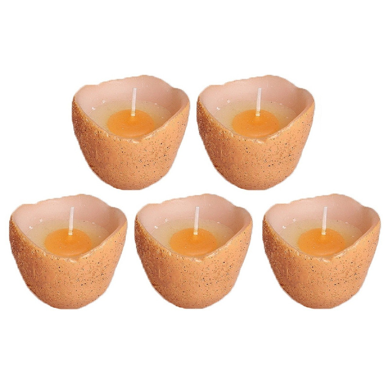 Een bruine kaars in de vorm van een eitje in eierschaal met een afmeting van ca. D4 x H5 cm. Materiaal: wax. Branduren: ca. 3 uur. U ontvangt 5 kaarsjes. Paastafel versiering/decoratie ei kaarsje bruin.