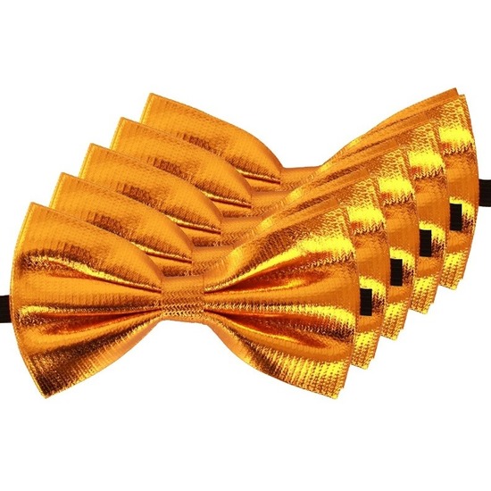 5x Gouden verkleed vlinderstrikjes/vlinderdasjes 14 cm voor dames/heren. Reeds gestrikte gouden strik/das met een elastieken band met haak en oog sluiting voor rond de hals, die u kunt verstellen middels een schuifje. Handige strik die u niet zelf hoeft te strikken. Materiaal: polyester, kunststof. Formaat: 13,5 cm x 7,5 cm. U ontvangt 5 strikjes. Goud thema Carnaval/feest verkleedaccessoires/feestartikelen voor volwassenen.