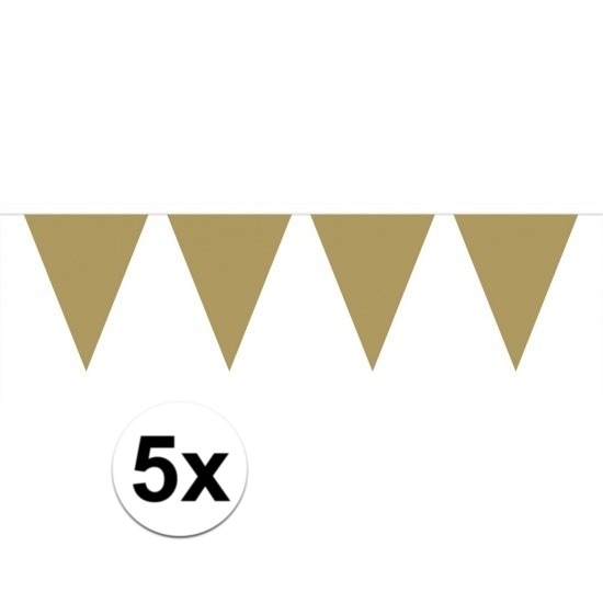 5x stuks vlaggenlijnen XL goud. Deze gouden vlaggenlijn is gemaakt van plastic en heeft een lengte van 6 meter. De vlaggenlijn bevat 10 vlaggetjes met een afmeting van 42 x 28 cm. Dubbelzijdig bedrukt, geschikt voor binnen gebruik en niet brandvertragend.