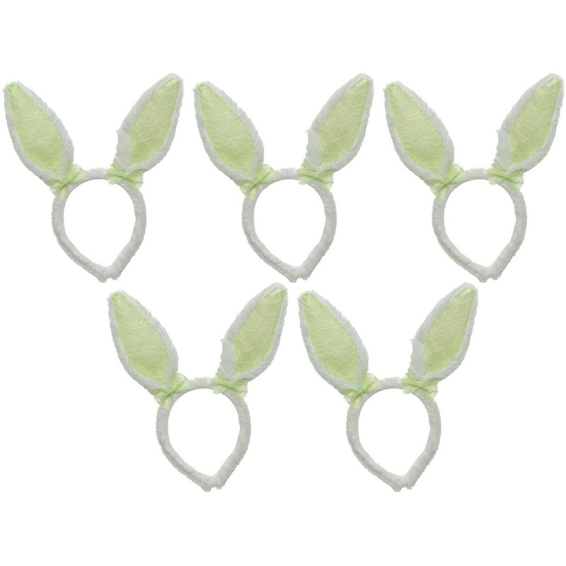 5x Witte konijnen/hazen oren verkleed diademen/tiara’s met groene strikjes en groene binnenzijde van de oren. Geschikt voor zowel kinderen (jongens/meisjes) als volwassenen (dames/heren). Materiaal: polyester. Formaat: 21,5 x 24 cm. Konijnenoren/hazenoren hoofdband. Ga verkleed als konijn of haas met deze verkleeddiadeem. Ideaal voor een kinderfeestje! U ontvangt 5 stuks.