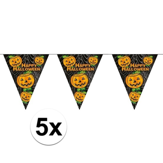5x Pompoenen vlaggenlijnen. Zwarte Halloween vlaggenlijnen met afbeeldingen van pompoenen. Elke vlaggenlijn is 5 meter lang en heeft 10 vlaggetjes. U ontvangt 5 stuks.
