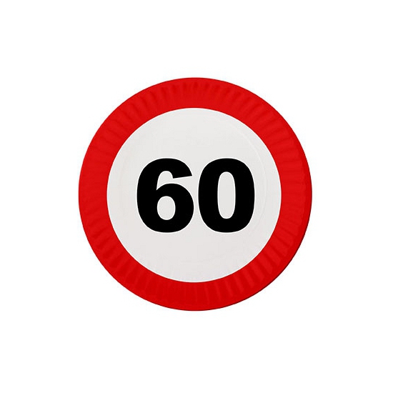 Kartonnen feestbordjes 60 jaar leeftijd verjaardag versiering. 16x stuks kartonnen borden met stopbord design en cijfer 60. De bordjes hebben een diameter van ongeveer 23 cm. 60 jaar verjaardag/feest thema wegwerpborden van karton. Tafeldecoratie feestartikelen en versiering voor de jarige.