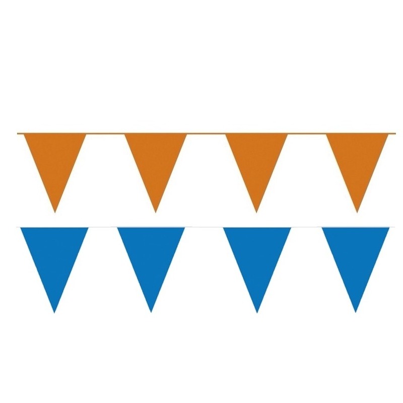 Oranje en blauwe vlaggetjes pakket. Totaal 60 meter vlaggetjes. Materiaal: plastic. , Dit artikel bestaat uit:, 3x Party Vlaggenlijn puntvlaggetjes – kunststof – blauw – 10 meter – Slinger – versiering, 3x Vlaggenlijn – 20 vlaggetjes – oranje – 10 meter
