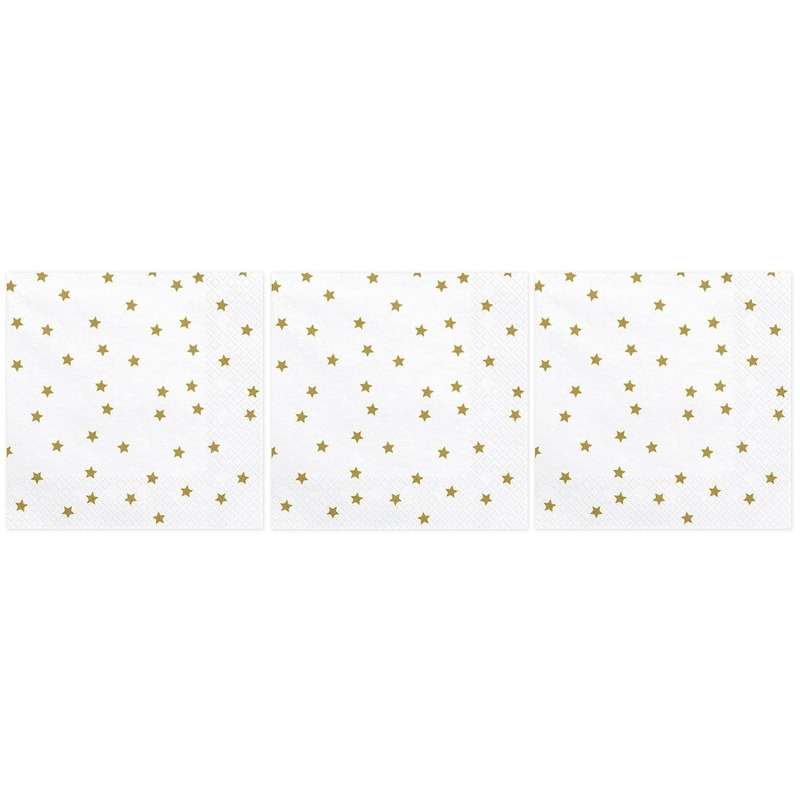 60x een pakje met 20 stuks witte kerstservetten, met print van gouden sterretjes. De servetten zijn 3-laags. Afmeting: uitgevouwen ca. 33 x 33 cm, ingevouwen ca. 16 x 16 cm. Materiaal: papier.
