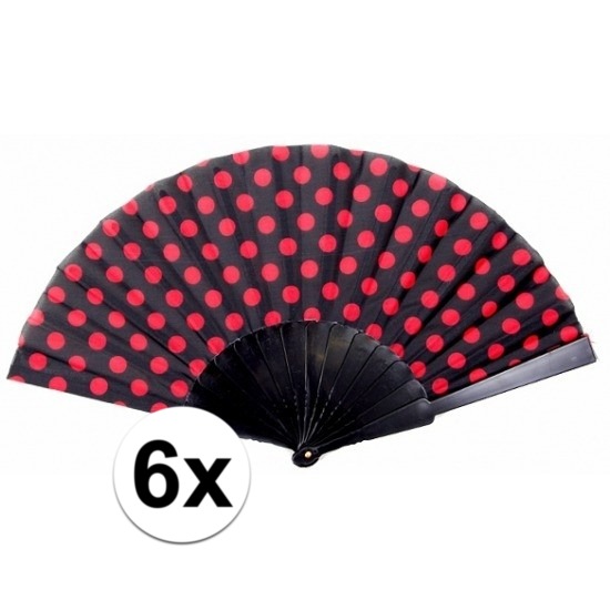 6x stuks Spaanse waaiers in de kleuren zwart met rode stippen. Deze waaiers zijn veelgebruikt als verkleedaccessoire. Formaat: ongeveer 24 cm.