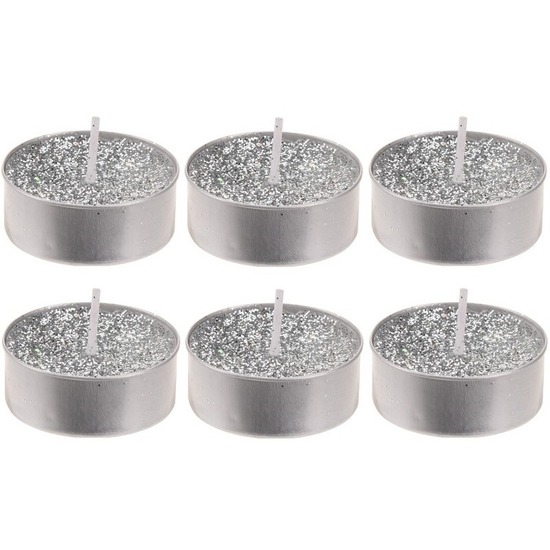Een set met 6 zilveren waxinelichtjes/theelichtjes, met glitters. Diameter: ca. 6 cm. Hoogte: ca. 2 cm. Branduren: ca. 8. Materiaal: wax/aluminium.