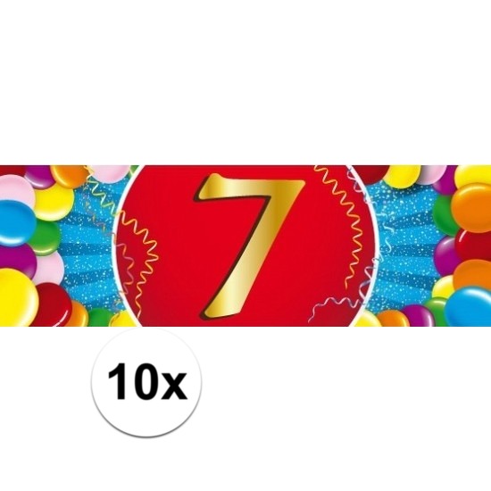 7 Jaar leeftijd versiering stickers 10 stuks. Vrolijk gekleurde stickers met het cijfer 7. Leuk als versiering voor een 7e verjaardag. Het formaat van de stickers is 19,6 x 6,5 cm. 7 jaar verjaardag/jubileum feestversiering artikelen.