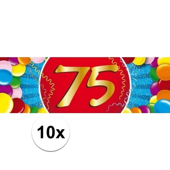 75 Jaar leeftijd versiering stickers 10 stuks. Vrolijk gekleurde stickers met het cijfer 75. Leuk als versiering voor een 75e verjaardag. Het formaat van de stickers is 19,6 x 6,5 cm. 75 jaar verjaardag/jubileum feestversiering artikelen.
