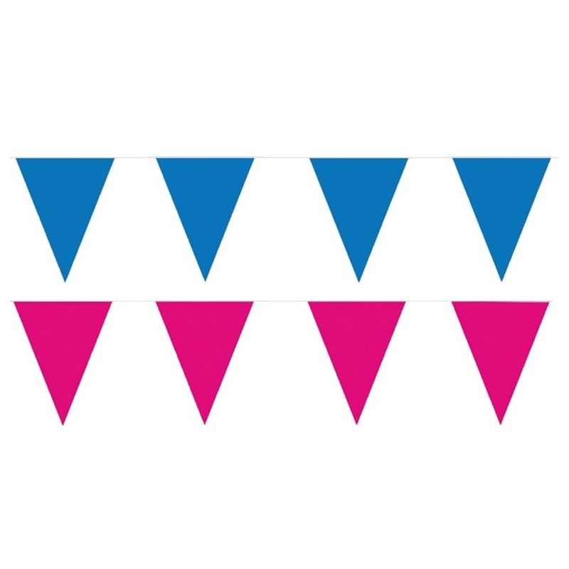 Roze en blauwe vlaggetjes pakket. Totaal 80 meter vlaggetjes. Materiaal: plastic. , Dit artikel bestaat uit:, 4x Party Vlaggenlijn puntvlaggetjes – kunststof – blauw – 10 meter – Slinger – versiering, 4x Party Vlaggenlijn puntvlaggetjes – kunststof – fuchsia – 10 meter – Slinger – versiering