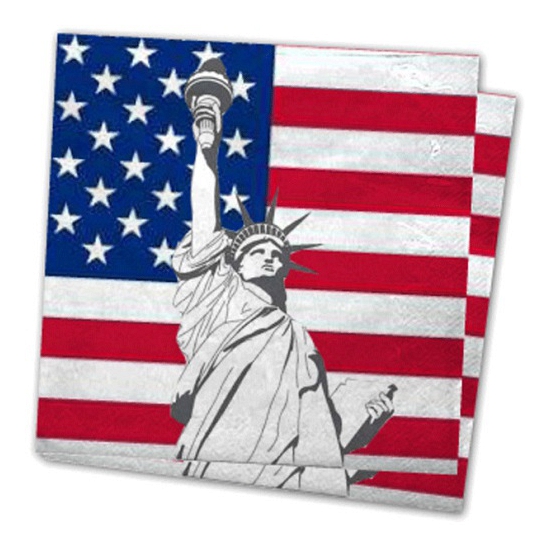 40x USA/Amerika landen vlag thema servetten, 33 x 33 cm. Wegwerp servetjes met de Amerikaanse kleuren en print van het Vrijheidsbeeld. Aantal: 20x stuks. Formaat per servet: 33 x 33 cm, indien uitgevouwen. Materiaal: 3-laags papier.