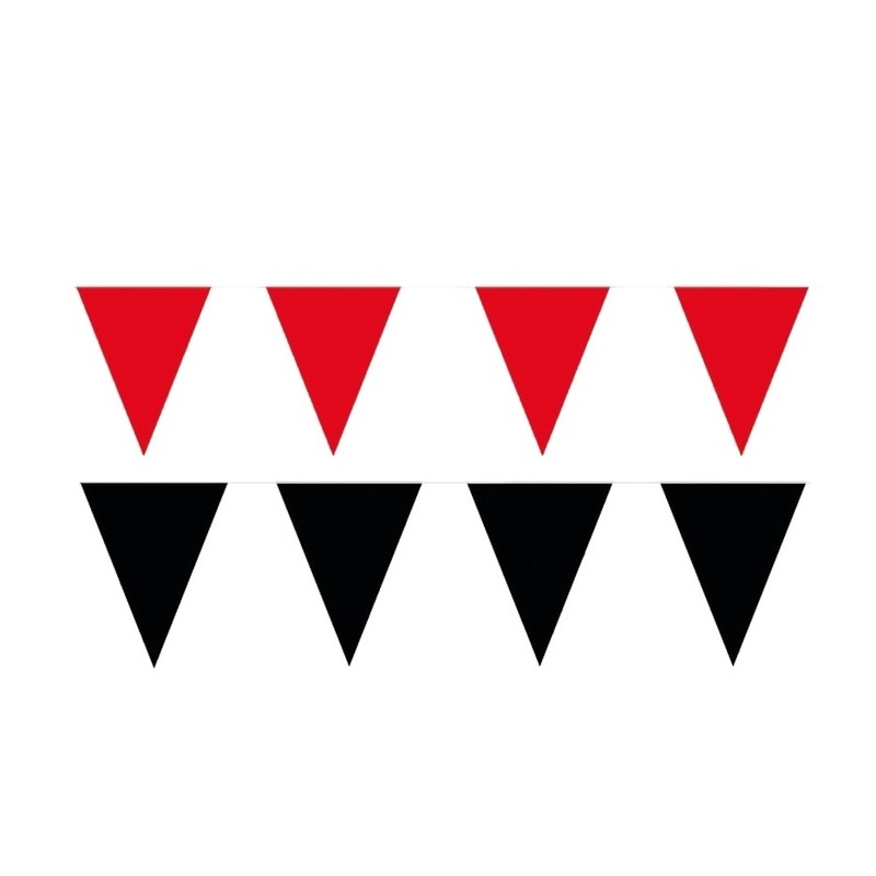 Zwart en rode vlaggetjes pakket. Totaal 60 meter vlaggetjes. Materiaal: plastic. , Dit artikel bestaat uit:, 3x Party Vlaggenlijn puntvlaggetjes – kunststof – rood – 10 meter – Slinger – versiering, 3x Party Vlaggenlijn puntvlaggetjes – kunststof – zwart – 10 meter – Slinger – versiering