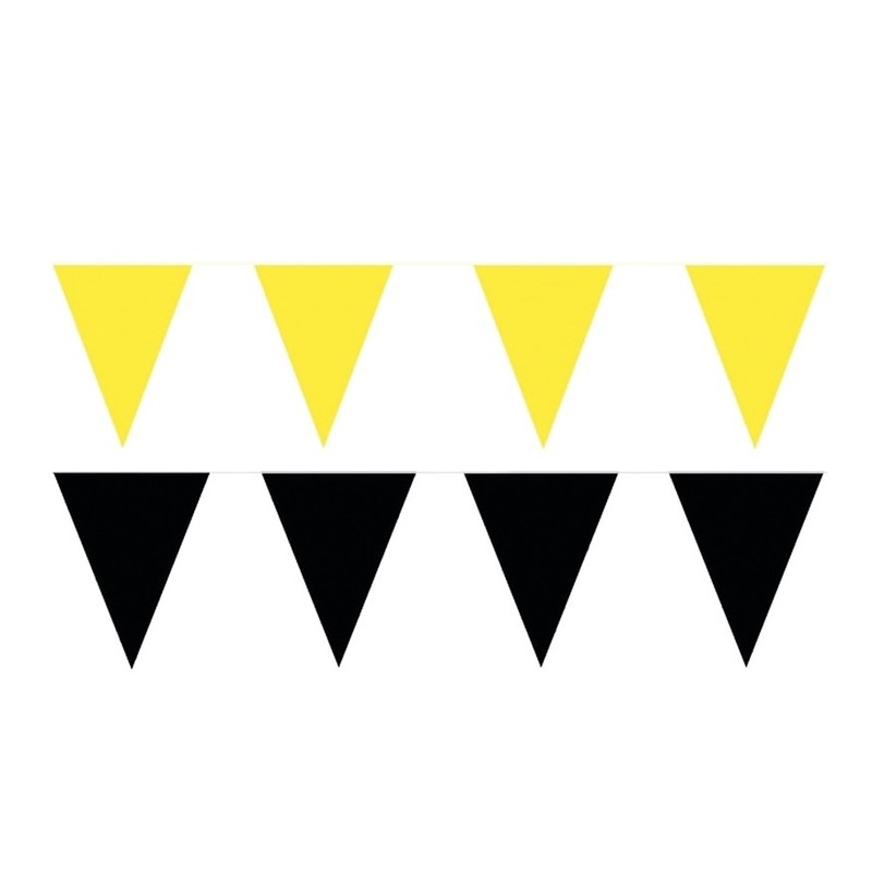 Zwart en gele vlaggetjes pakket. Totaal 60 meter vlaggetjes. Materiaal: plastic. , Dit artikel bestaat uit:, 3x Party Vlaggenlijn puntvlaggetjes – kunststof – geel – 10 meter – Slinger – versiering, 3x Party Vlaggenlijn puntvlaggetjes – kunststof – zwart – 10 meter – Slinger – versiering