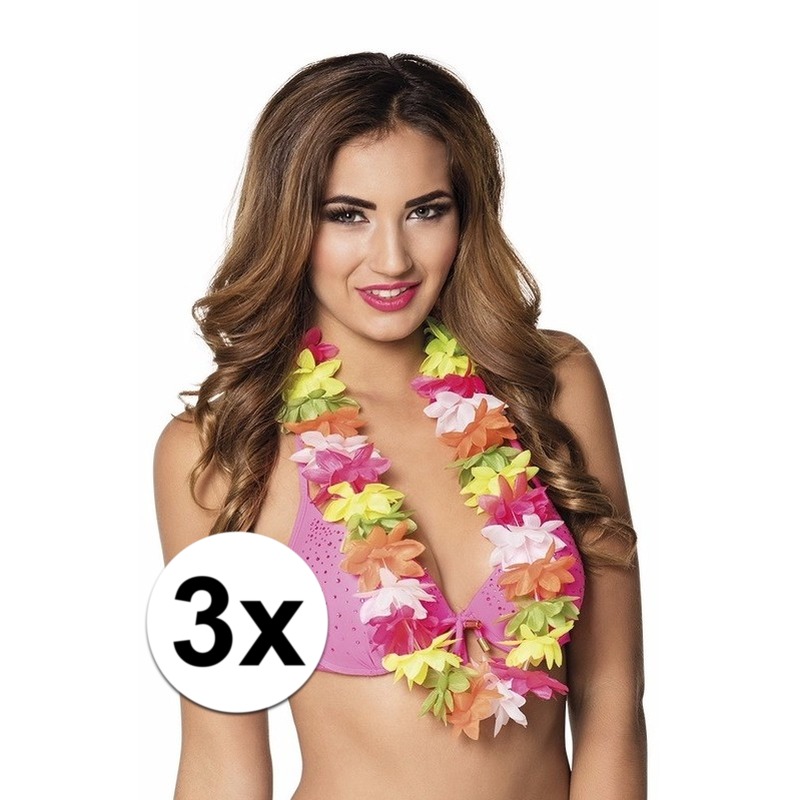 3x gekleurde Hawaii krans bloemenslinger/bloemenkrans van 50 cm. Hawaii krans met gekleurde bloemen van ca. 6 cm groot per stuk. De ketting is ca. 50 cm lang van nek tot einde. Materiaal: polyester/plastic. Feestartikelen en thema versieringen.