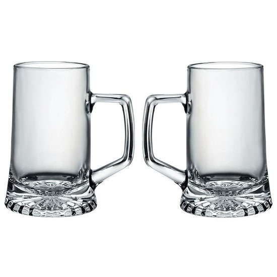 Een set met 4x stuks bierglazen/bierpullen, met een inhoud van ca. 510 ml, 51cl. Afmeting: ca. 8 x 15 cm, incl. handvat ca. 12 cm breed. Materiaal: glas. Vaatwasser bestendig.