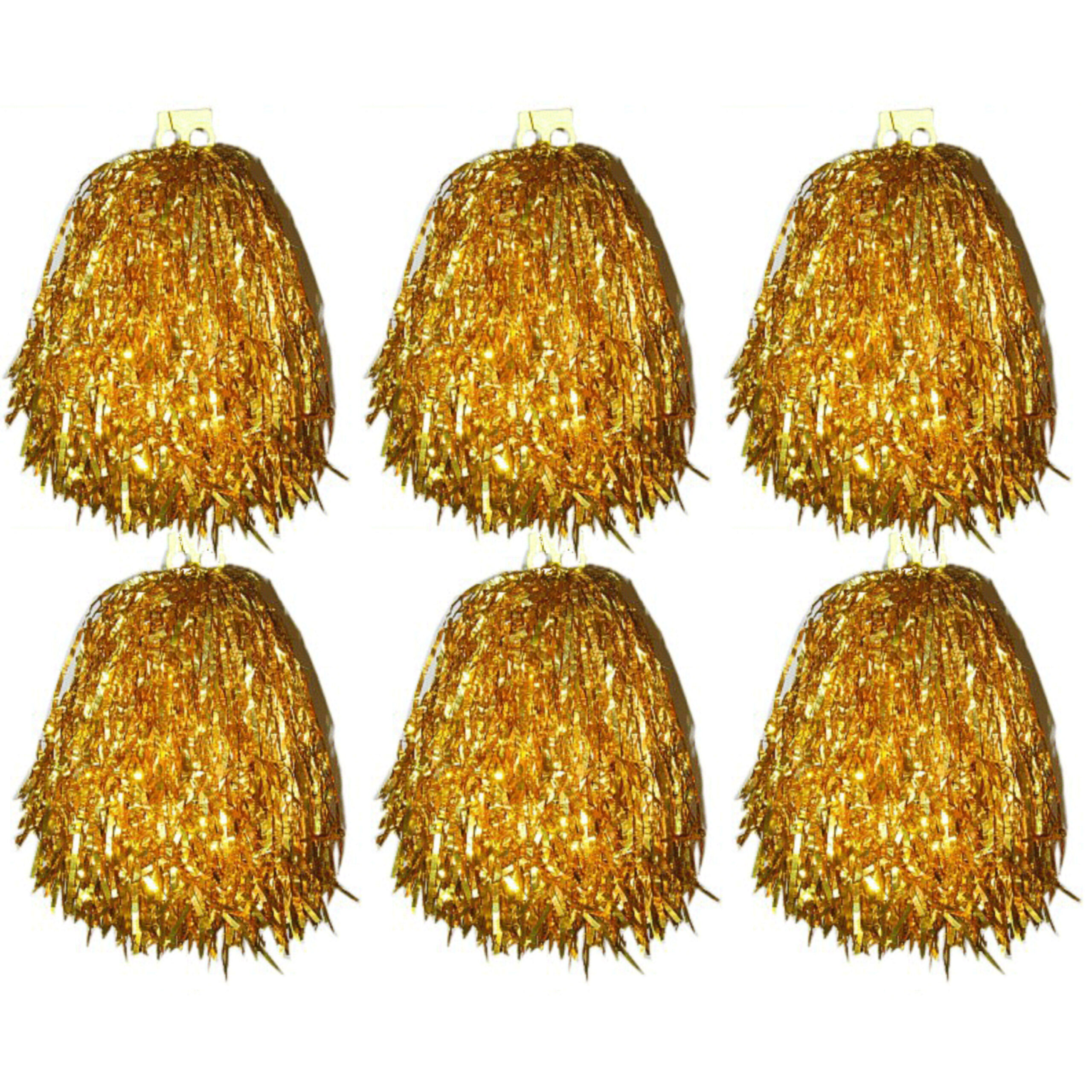 6x Stuks Cheerball/pompom in het goud voor cheerleaders. Lengte: ca. 33 cm. Materiaal: kunststof/folie. Gewicht: ca. 80 gram. Handvat: dubbele ringgreep. Carnaval verkleedkleding accessoires.