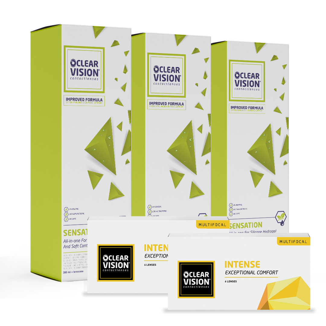 Over je contactlenzen: ClearVision Intense Multifocal maandlenzen ClearVision Intense Multifocal zijn multifocale lenzen die presbyopie corrigeren. De contactlenzen bieden scherp zicht van dichtbij en veraf. Hierdoor kun je op alle afstanden goed zien. Het draagcomfort is verbeterd dankzij de nieuwste MoistureSeal-technologie en silicone hydrogel materiaal dat tot 95% van de lensvochtigheid tot 16 uur per dag vasthoudt.Belangrijke voordelen van ClearVision Intense MultifocalMet maandlenzen geniet je tot 30 dagen van uitstekend zicht Multifocale lenzen corrigeren presbyopie Vasthoudend materiaal voor gezonde ogen tot 16 uur per dag Uitstekend zicht op alle afstanden Uitstekend draagcomfort gedurende de hele dag Over je lenzenvloeistof: ClearVision Multi-Purpose Solution 6 maanden 3x350mlDe ClearVision multifunctionele oplossing voor 6 maanden 3×350 ml, ook bekend als de alles-in-één lenzenvloeistof. De vloeistof is geschikt voor zachte lenzen. De ClearVision Multi-Purpose Solution 6 maanden 3x350ml reinigt niet alleen je contactlenzen, maar desinfecteert deze ook. Zo ben je verzekerd van een hygiënisch en comfortabel draaggemak.De ClearVision Multi-Purpose Solution 6 maanden 3x350ml heeft hyaluron, wat zorgt voor een ultiem vochtbalans. Dit zorgt voor meer comfort en een betere bescherming van je oog. De lenzenvloeistof voorkomt allergische reacties en is daardoor zeer geschikt voor gevoelige ogen. AdviesMocht je van lenzenvloeistof, oogdruppels of contactlenzen wisselen, adviseren wij je contact op te nemen met je opticien of oogarts. De opticien of oogarts kan je duidelijk advies geven over welke producten het beste bij je oog passen.Online bestellen bij 123Optic123Optic is een online webshop met een groot assortiment aan oogproducten. Bekijk snel ons brede assortiment contactlenzen, lenzenvloeistoffen en andere leuke accessoires. Heb je vragen over een product, dan kan je altijd contact met ons opnemen via mail, chat of telefoon. We beantwoorden graag al je vragen. Ontdek de voordelen van online winkelen bij 123Optic!