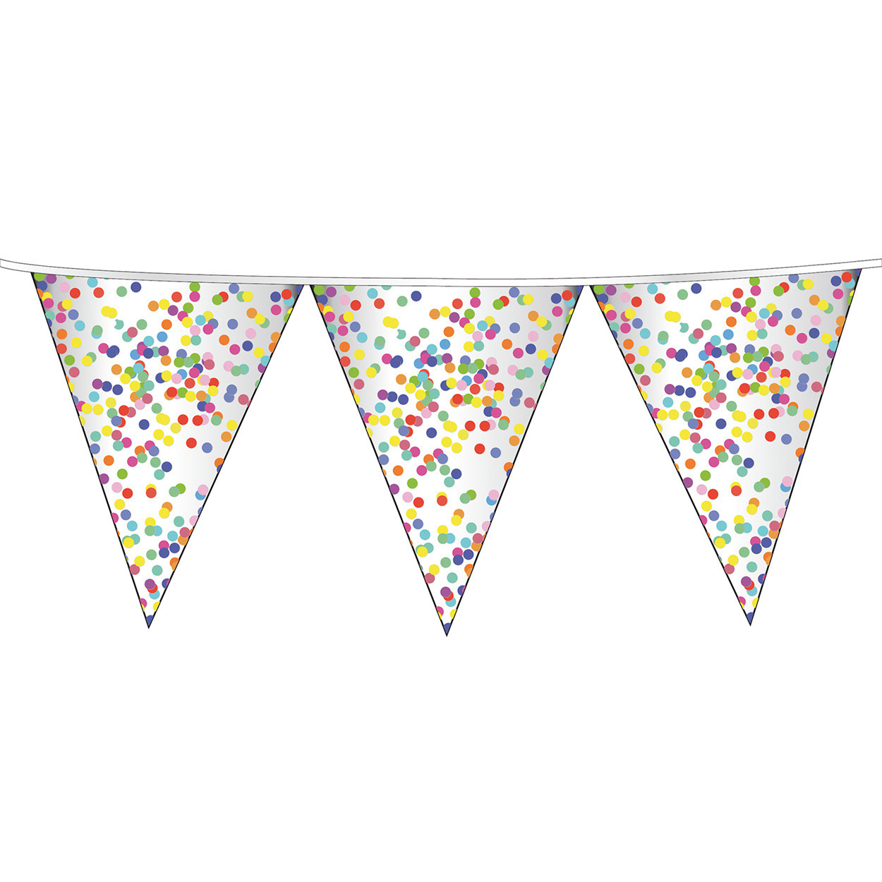 10x een transparante party/feest vlaggenlijn, met een print van gekleurde confetti. De vlaggenlijn bevat 15 vlaggetjes welke dubbelzijdig zijn bedrukt. Voor meer producten uit deze serie zoekt u op de term: confettifeestthema.
