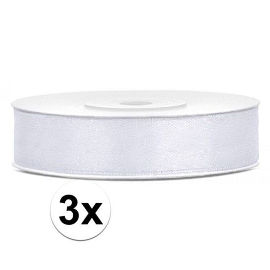 3x hobby/decoratie wit satijnen sierlint van 12 mm x 25 meter. Geef je cadeaus een luxe uitstraling met dit satijnen sierlint in een stralend kleur! Dit lint is perfect voor het afwerken van presentjes, het versieren van feestdecoraties of het toevoegen van een elegant detail aan je knutselprojecten. Met een lengte van 25 meter en een breedte van 12 mm kun je eindeloos vari?ren. Of het nu gaat om een verjaardag, bruiloft of andere speciale gelegenheid, dit lint maakt het helemaal af! Maak je cadeaus extra bijzonder ? met dit sierlint zit de charme in de details!