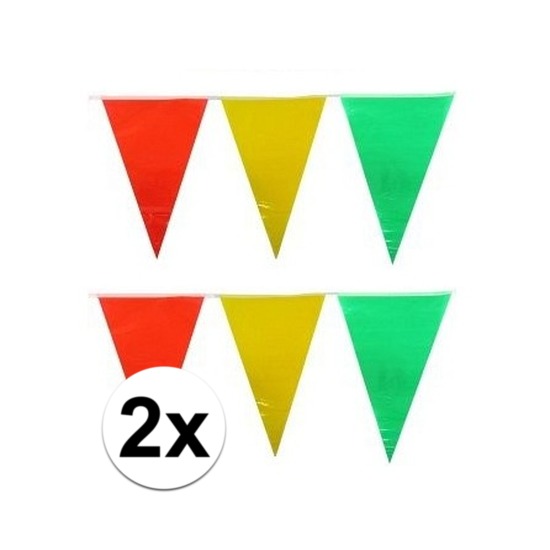 2x vlaggenlijnen in de kleuren geel/rood/groen van 10 meter. Deze plastic vlaggenlijn in de kleuren, rood, geel en groen heeft een lengte van ongeveer 10 meter. De vlaggen hebben per stuk een formaat van ongeveer 30 cm.