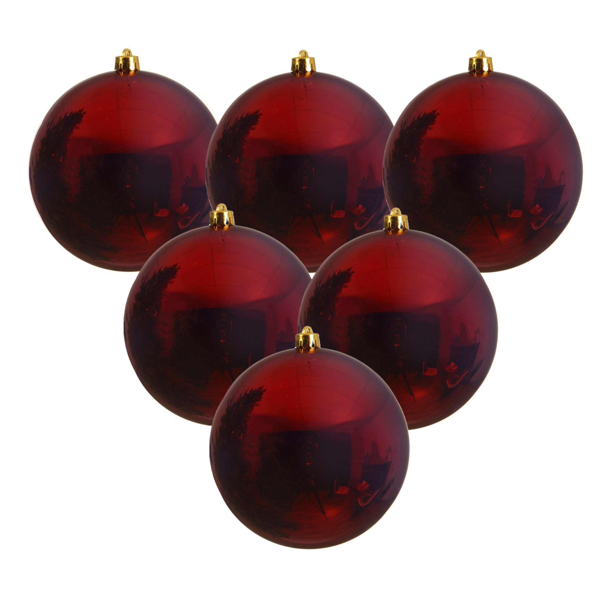 6x groot formaat kerstbal in de kleur donkerrood. Met een indrukwekkende diameter van 20 cm en een glanzende afwerking, is deze kunststof kerstbal perfect voor het maken van een opvallend en feestelijk accent in je huis. Deze veelzijdige kerstbal is ideaal voor diverse toepassingen. Hang hem op aan een lint aan het plafond, aan de deur of raam voor een warm welkom, of gebruik hem om een grote kerstboom te versieren. Voor een stijlvolle presentatie aan de deur kun je ook gebruik maken van speciale deurhangers voor kerstkransen, waaraan je deze grote kerstbal kunt ophangen.