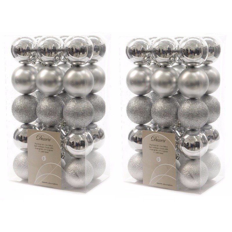 Kerstballen in de kleur zilver. Breng sprankeling in je kerstboom met deze set van 60x stuks kerstballen van Decoris. Deze onbreekbare kerstballen set bevat een mooie mix van afwerkingen, perfect voor een levendige en elegante kerstboom. Met een diameter van 6 cm omvat de set een mix van afwerkingen: glans, mat en glitter.