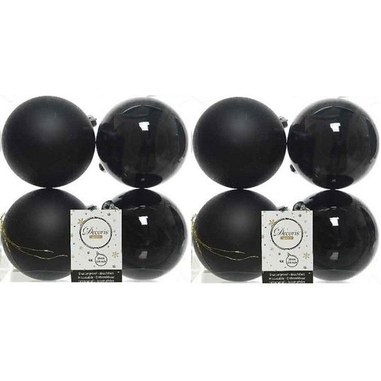 Decoris kerstballen in de kleur zwart. Verhoog de elegantie van je kerstdecoratie met deze set van 8x st kerstballen. Elk van de 10 cm grote ballen heeft een luxe uitstraling door de combinatie van matte en glanzende afwerkingen. Deze onbreekbare kerstballen zijn vervaardigd uit kunststof, wat ze ideaal maakt voor een veilige decoratie. Elke bal is voorzien van een gouden ophanglintje voor een extra vleugje glamour. Hoewel de kerstballen standaard worden geleverd met ophangdraadjes, raden wij aan om kerstbalhaakjes (niet inbegrepen) mee te bestellen voor een gemakkelijke en stevige ophangmogelijkheid.