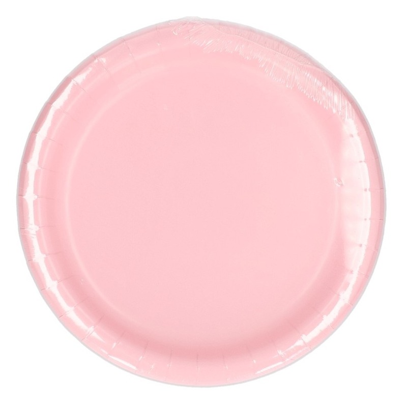 Kartonnen feestbordjes in de kleur roze met een dia van 23 cm. 24x stuks kartonnen borden. De bordjes hebben een diameter van ongeveer 23 cm. Tafeldecoratie feestartikelen en versiering.