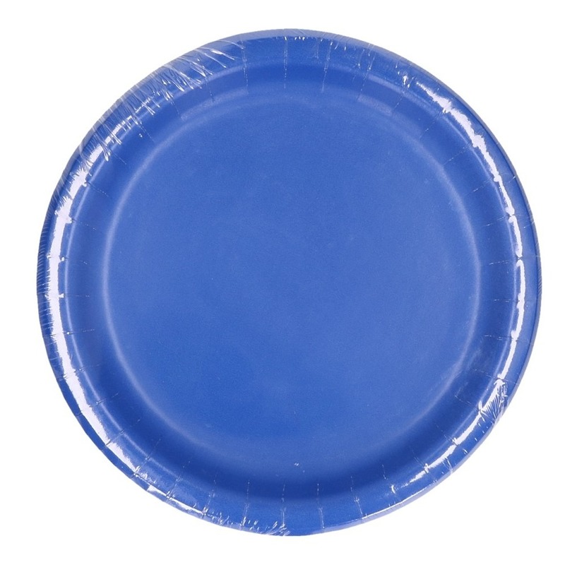 Kartonnen feestbordjes in de kleur blauw met een dia van 23 cm. 32x stuks kartonnen borden. De bordjes hebben een diameter van ongeveer 23 cm. Tafeldecoratie feestartikelen en versiering.