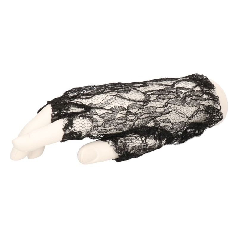 Zwarte korte rocker/punker kanten handschoenen voor volwassenen. Korte vingerloze kanten jaren 90 handschoenen in het zwart, geschikt voor volwassenen. Een leuke toevoeging bij een verkleedoutfit! Maat: One size, past tot maat M/XL. Materiaal: 100% polyester.
