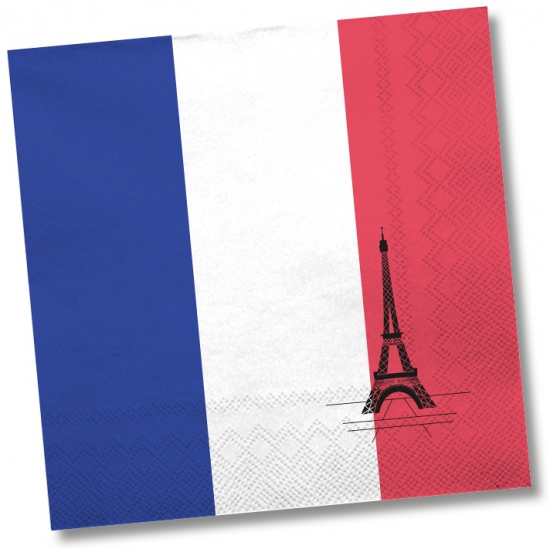 Frankrijk thema vlag feest papieren servetten, 40x stuks. Deze servetten in Frankrijk thema hebben een oppervlak van 33 x 33 cm en zijn gemaakt van 3 laags papier. Dit maakt ze een gemakkelijk alternatief voor servetten die je zelf moet wassen, hierdoor zijn ze uitermate geschikt voor alle feestelijke gelegenheden. Maak je themafeest, BBQ of picknick compleet met deze handige wegwerp servetten.