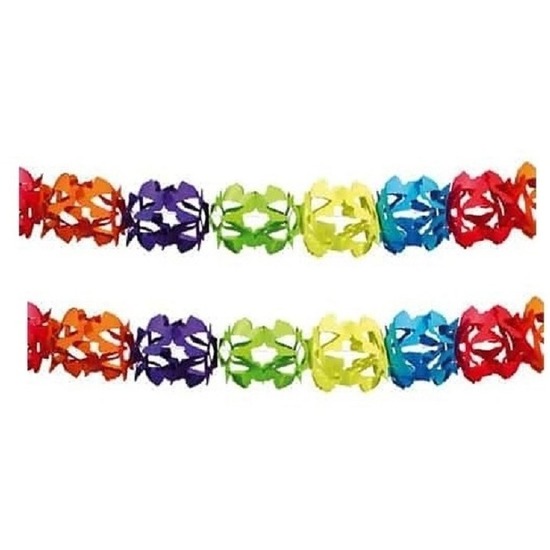 2x regenboog kleuren slinger 6 meter. Een vrolijk gekleurde papieren slinger in kruisvorm van brandvertragend papier. Met deze papieren slinger cre?er je eenvoudig overal een feestelijke sfeer.