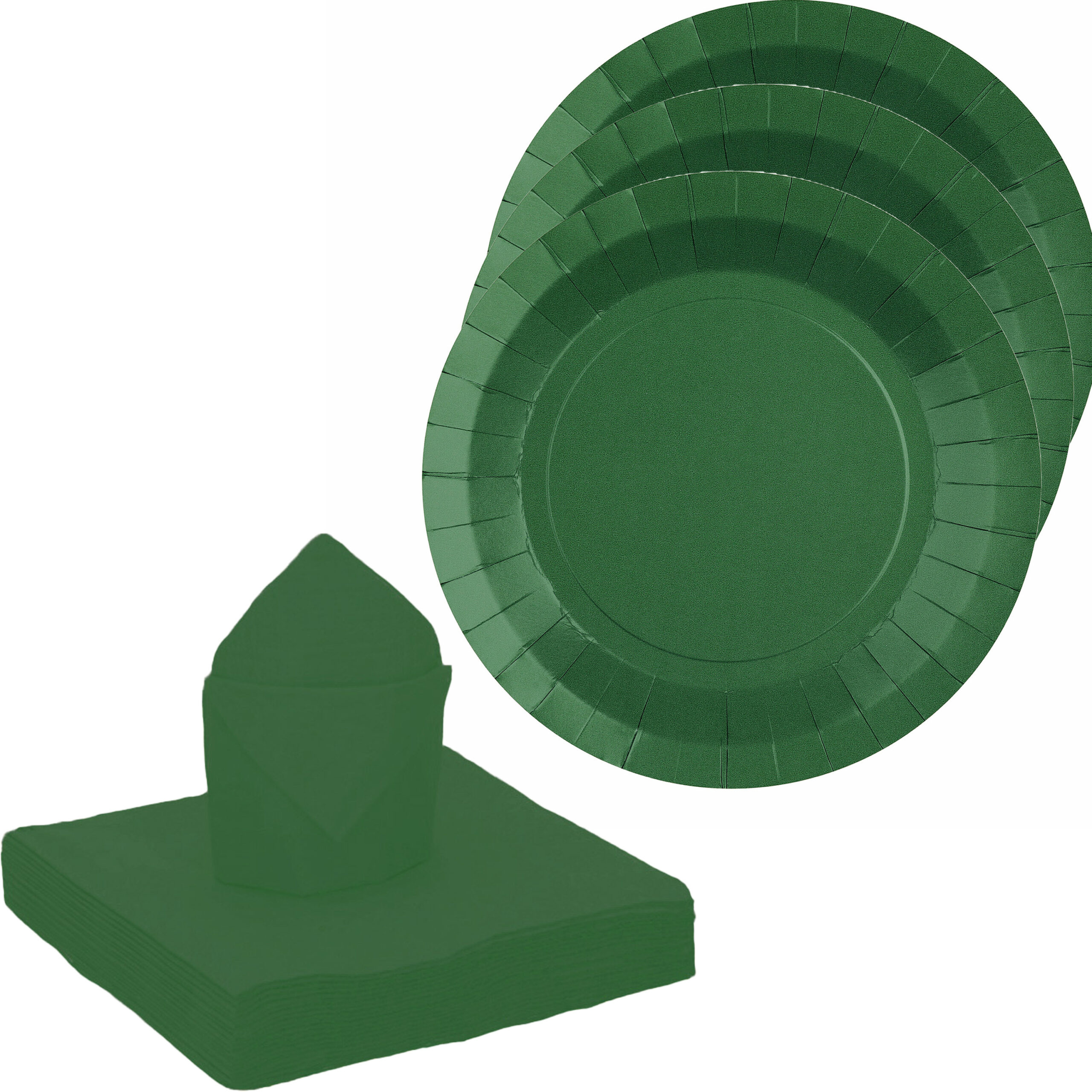 Santex feest/verjaardag servies set bestaande uit 10x feestbordjes rond en 25x groot formaat servetten in de kleur donkergroen. Wegwerp party bordjes van stevig karton, om ieder feestje mee compleet te maken. De servetten zijn van hoge kwaliteit stevig papier.