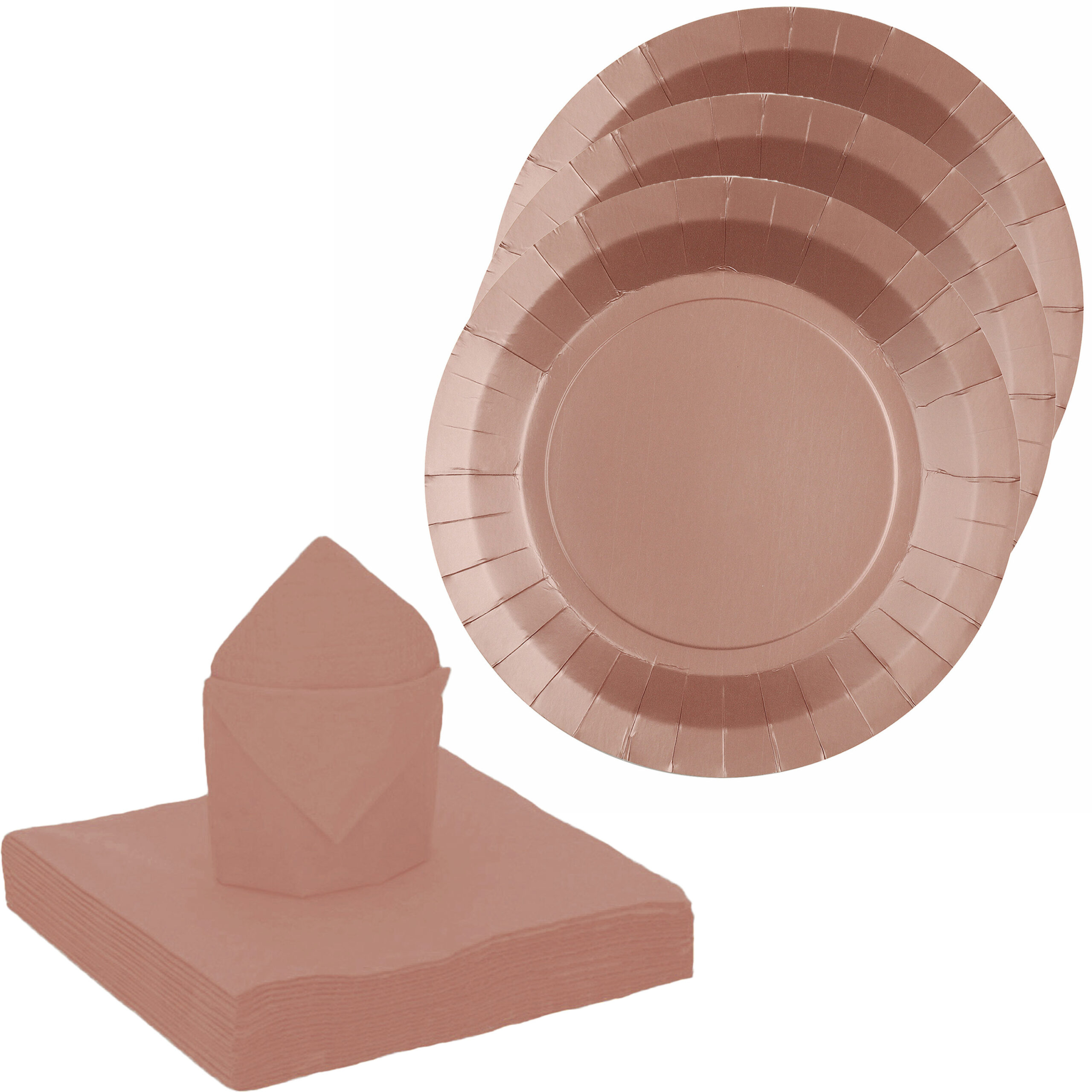 Santex feest/verjaardag servies set bestaande uit 20x feestbordjes rond en 25x groot formaat servetten in de kleur rose goud. Wegwerp party bordjes van stevig karton, om ieder feestje mee compleet te maken. De servetten zijn van hoge kwaliteit stevig papier.