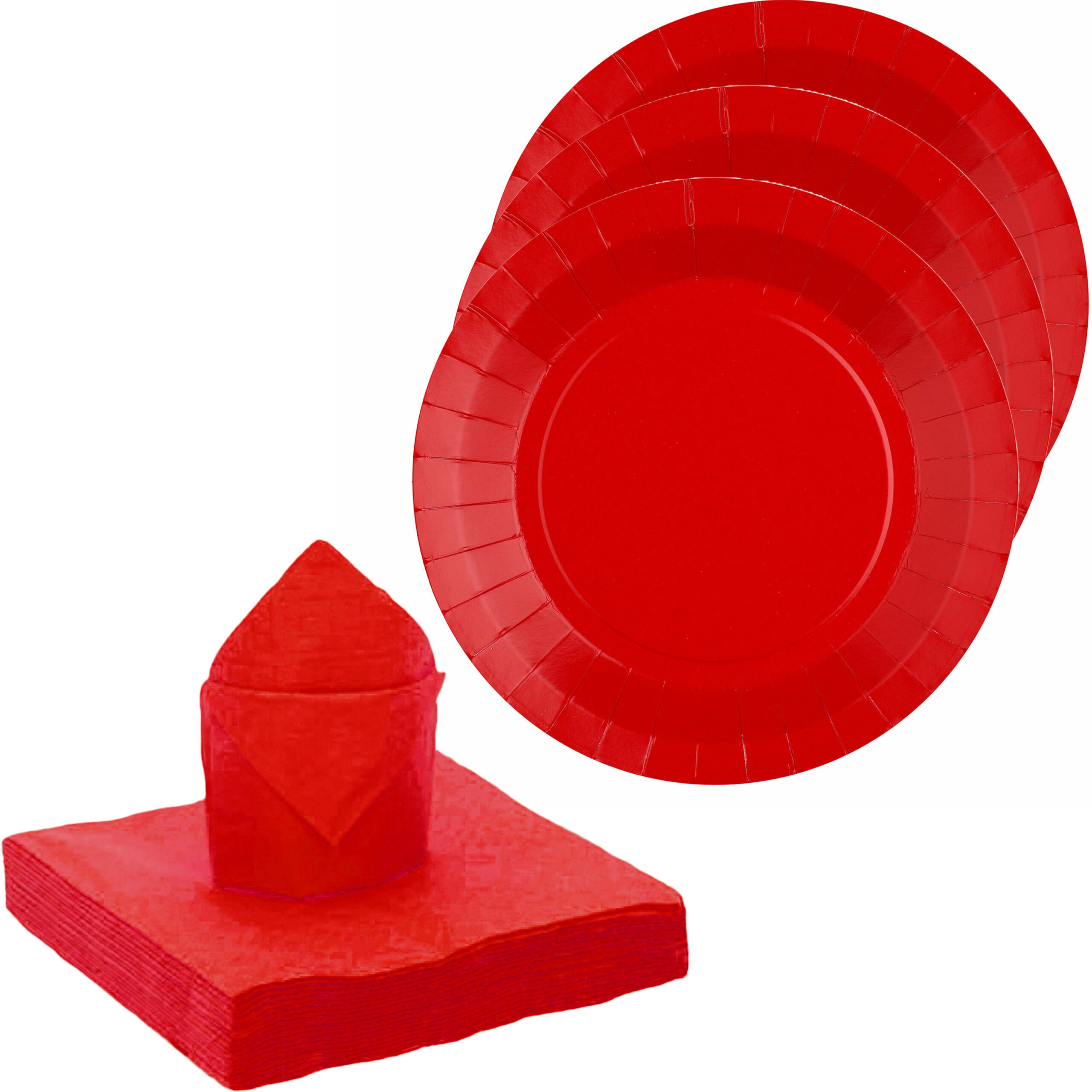 Santex feest/verjaardag servies set bestaande uit 20x feest gebaksbordjes/taartbordjes rond en 25x groot formaat servetten in de kleur rood. Wegwerp party bordjes van stevig karton, om ieder feestje mee compleet te maken. De servetten zijn van hoge kwaliteit stevig papier.