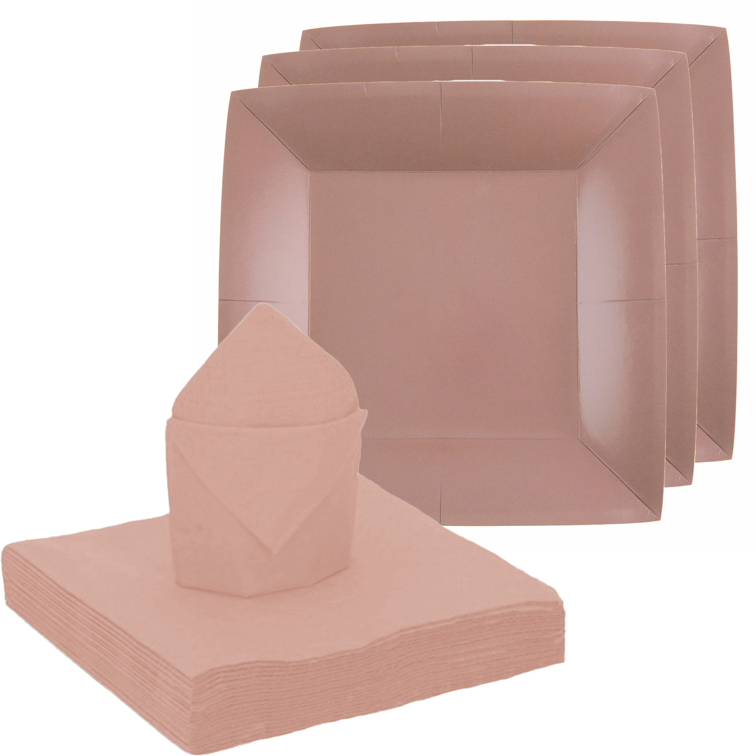 Santex feest/verjaardag servies set bestaande uit 20x feest gebaksbordjes/taartbordjes vierkant en 25x groot formaat servetten in de kleur rose goud. Wegwerp party bordjes van stevig karton, om ieder feestje mee compleet te maken. De servetten zijn van hoge kwaliteit stevig papier.