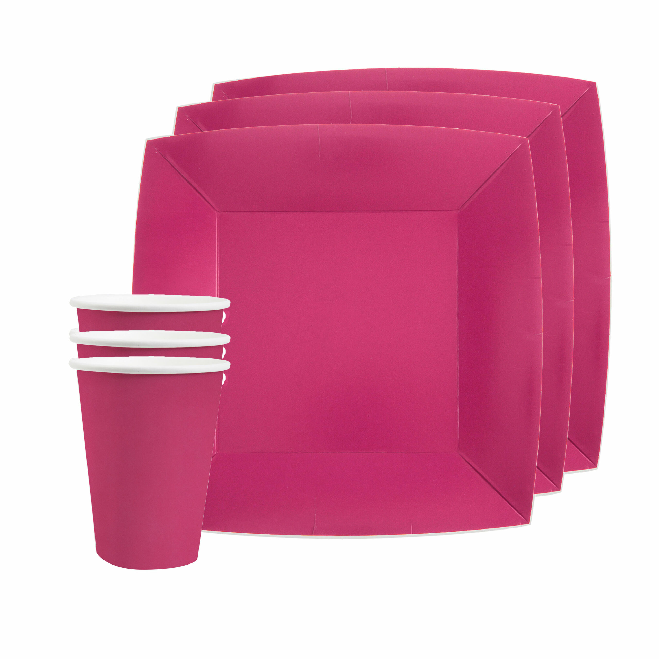 Santex feest/verjaardag servies set bestaande uit 20x feest gebaksbordjes/taartbordjes vierkant en 20x bekertjes in de kleur fuchsia roze. Wegwerp party bordjes en bekers van stevig karton, om ieder feestje mee compleet te maken.