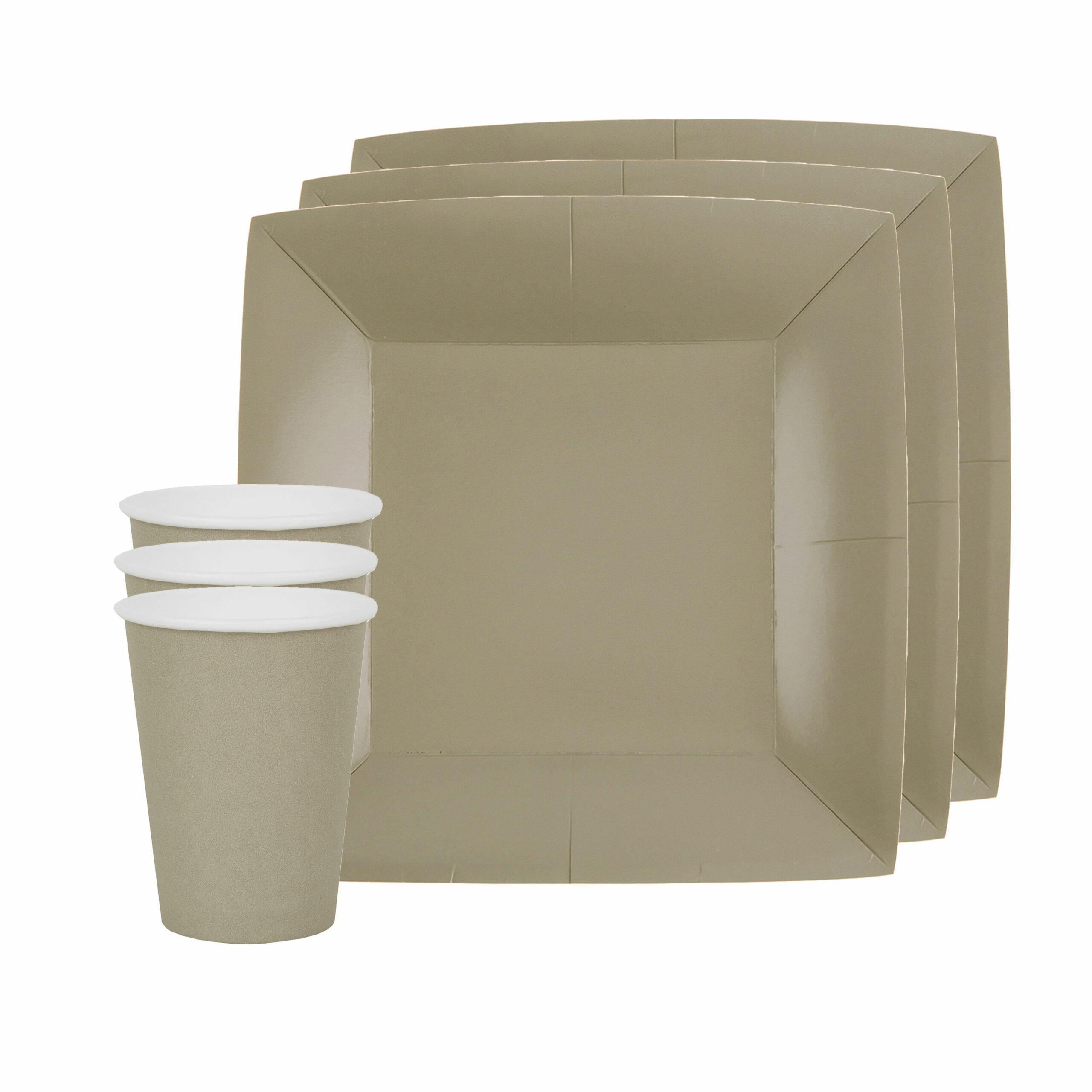Santex feest/verjaardag servies set bestaande uit 20x feest gebaksbordjes/taartbordjes vierkant en 20x bekertjes in de kleur taupe/beige. Wegwerp party bordjes en bekers van stevig karton, om ieder feestje mee compleet te maken.