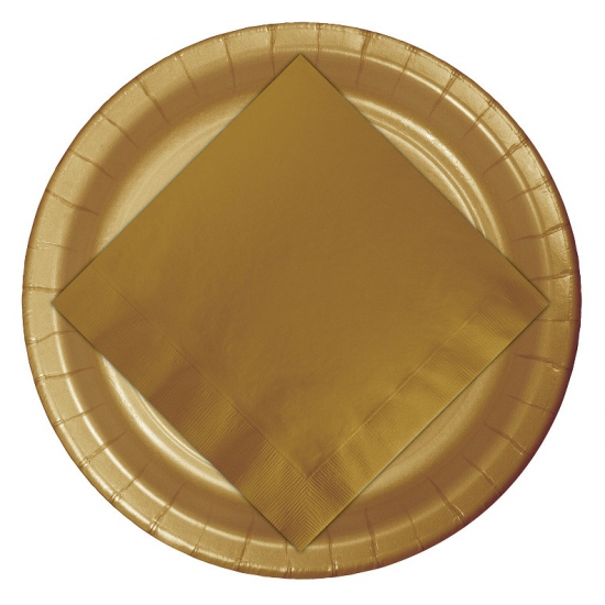 Kartonnen feestbordjes goud 23 cm. 48x stuks kartonnen borden in gouden kleur. De bordjes hebben een diameter van ongeveer 23 cm. Maak je strandfeest, BBQ of picknick compleet met deze handige wegwerp servies/borden. Deze bordjes hebben een diameter van 27 cm, waardoor ze uitermate geschikt zijn voor alle soorten feestelijke gelegenheden. Voor de complete feesttafel gebruik je ook de bekers en servetten uit dezelfde serie.
