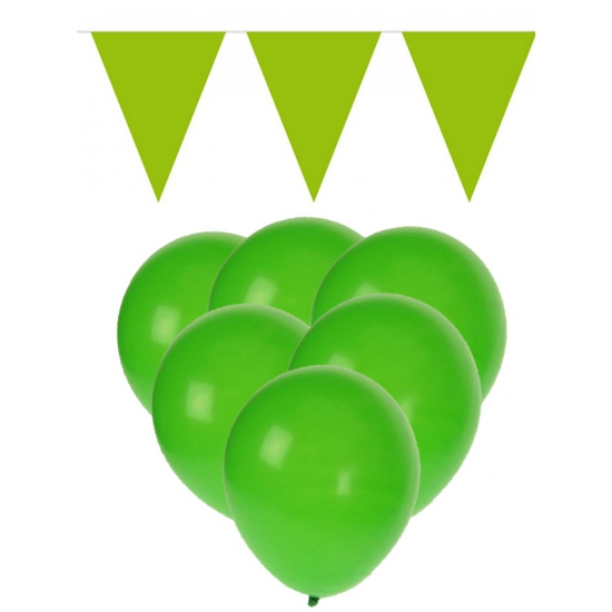 Groene decoratie set met 15 groene ballonnen en 2 groene vlaggenlijnen. Groene versiering set: 15 groene ballonnen van ongeveer 27 cm (geschikt voor helium of lucht) en 2 groene vlaggenlijnen van 10 meter. , Dit artikel bestaat uit:, 2x Party Vlaggenlijn puntvlaggetjes – kunststof – groen – 10 meter – Slinger – versiering, 1x Bellatio Decorations ballonnen – 15x stuks – groen – 27 cm – verjaardag – feestartikelen