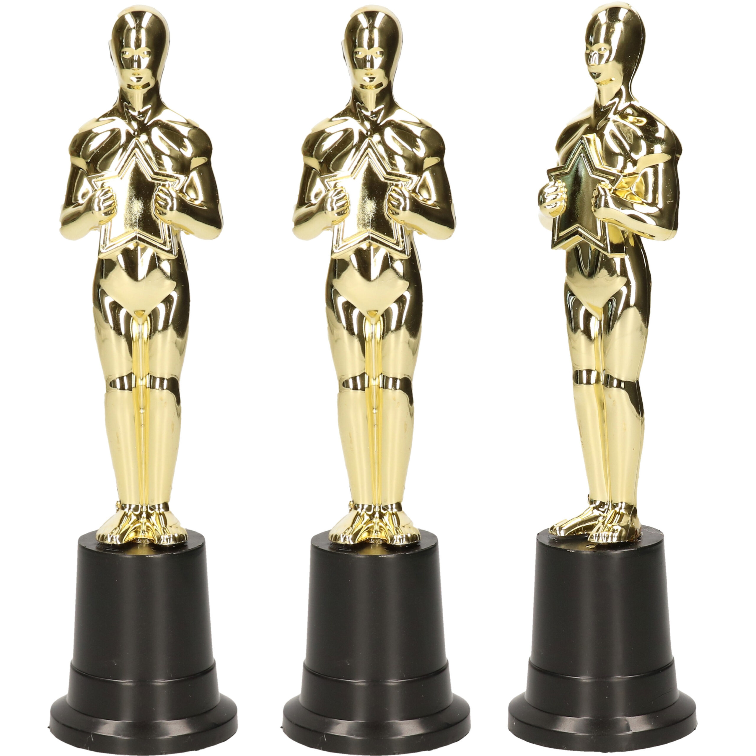 5x film/oscar trofee goud. Voel je een echte filmster met dit Filmster/Oscar award beeldje van 22 cm! Deze elegante, gouden trofee is perfect voor een Hollywood-themafeest, filmavond, talentenjacht of als grappige prijs tijdens een quiz of wedstrijd. Het beeldje is ge?nspireerd op de beroemde Oscar-award en voegt een vleugje glamour en prestige toe aan elk evenement. Gebruik het als decoratie of geef het aan de ?beste acteur? van de avond. Een unieke eyecatcher die je gasten laat stralen als echte sterren! Een must-have voor elke filmliefhebber en een geweldig cadeau-idee.
