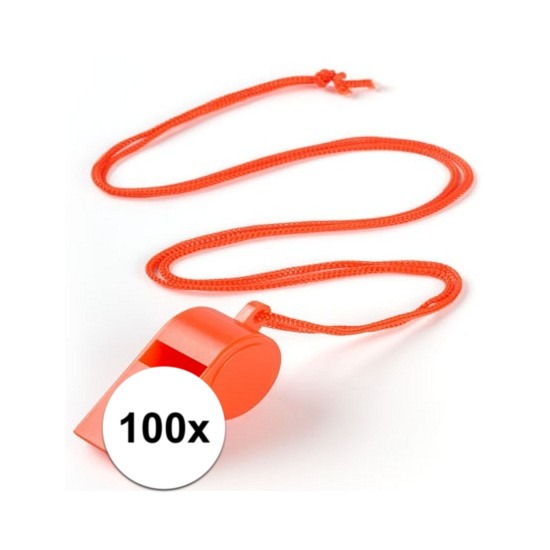 *Set van 100x Stuks oranje kunststof fluitjes met koord*